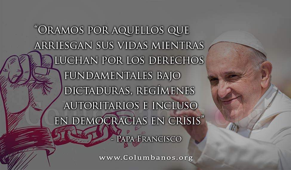 "Oramos por aquellos que arriesgan sus vidas mientras luchan por los derechos fundamentales bajo dictaduras, regímenes autoritarios e incluso en democracias en crisis", dijo.  El Papa Francisco es muy consciente de la lucha y las necesidades de estos dedicados activistas de derechos humanos que luchan por la justicia, la paz y la dignidad humana. Los que están a favor de la igualdad racial en la campaña "Vida de Negros Importa" y los que luchan por los derechos de las mujeres y los niños en el "Movimiento Yo También".